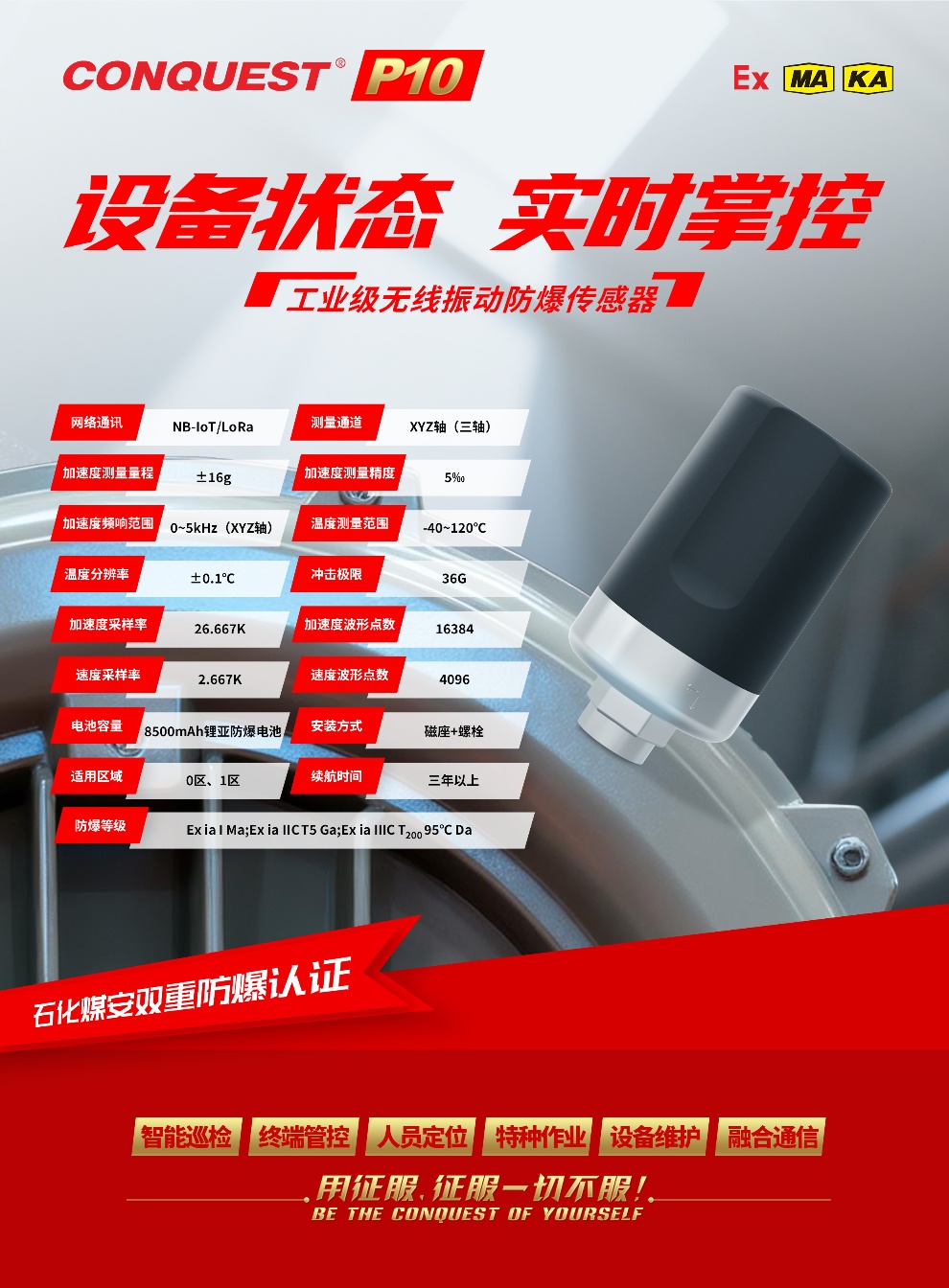 CONQUEST征服P10无线温振传感器是一款集高精度测量、无线传输、超低功耗、防爆安全与智能管理于一体的工业级监测设备。其在实际应用中,是实现设备状态感知数字化、运维管理智能化、安全保障本质化的关键终端,为工业企业的安全生产与降本增效提供有力支撑。